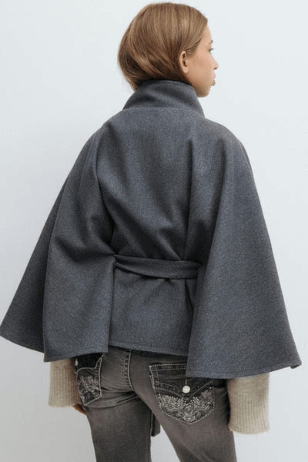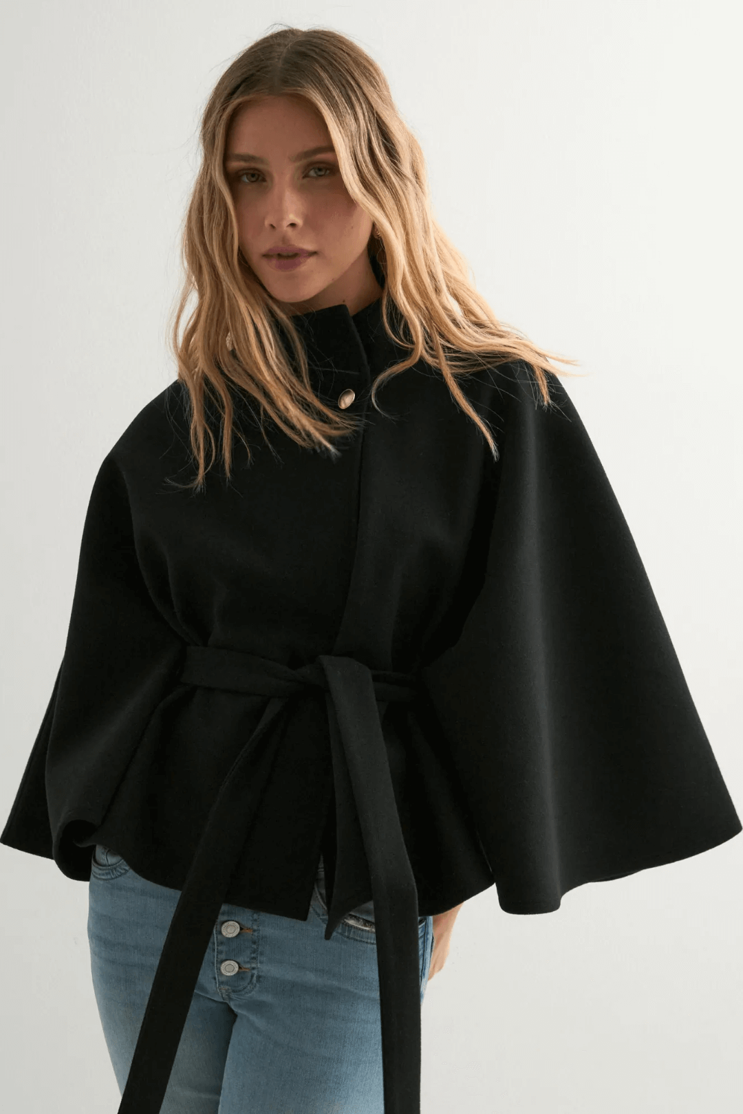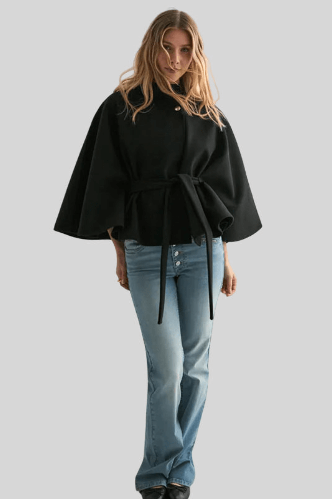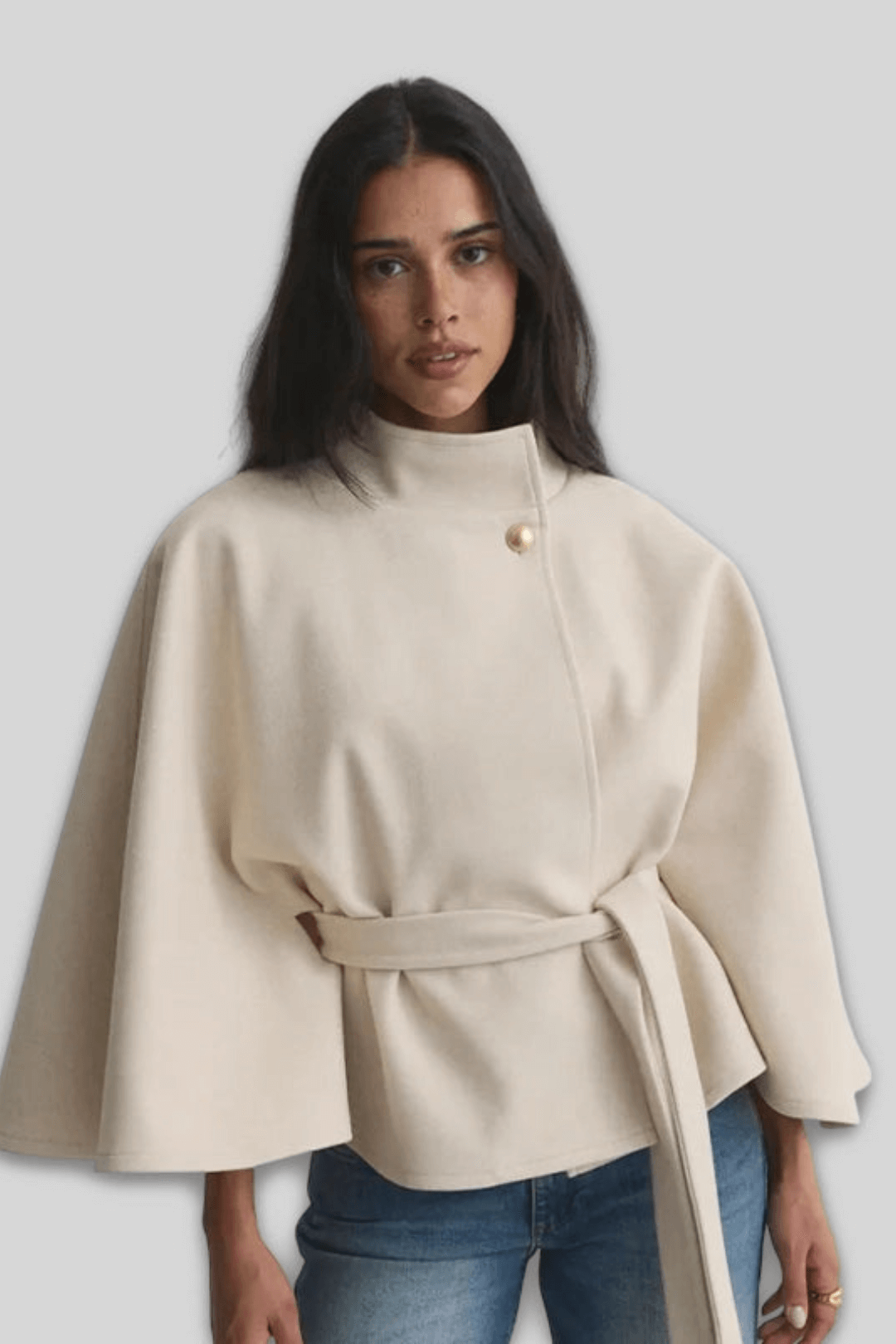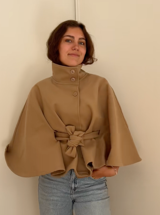 Cape-manteau élégante dotée d’une ceinture à nouer à la taille pour sublimer la silhouette. Ses manches longues et amples apportent confort et aisance, tandis que sa coupe oversize et son col montant offrent une allure moderne et sophistiquée. Fermeture pratique avec boutons discrets sur le haut pour une touche raffinée.