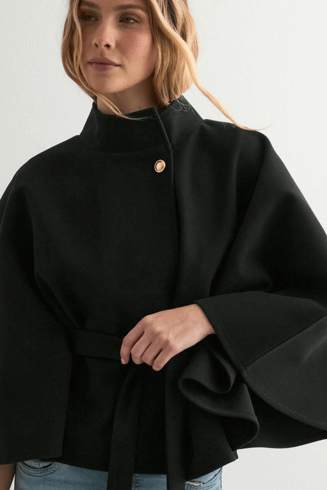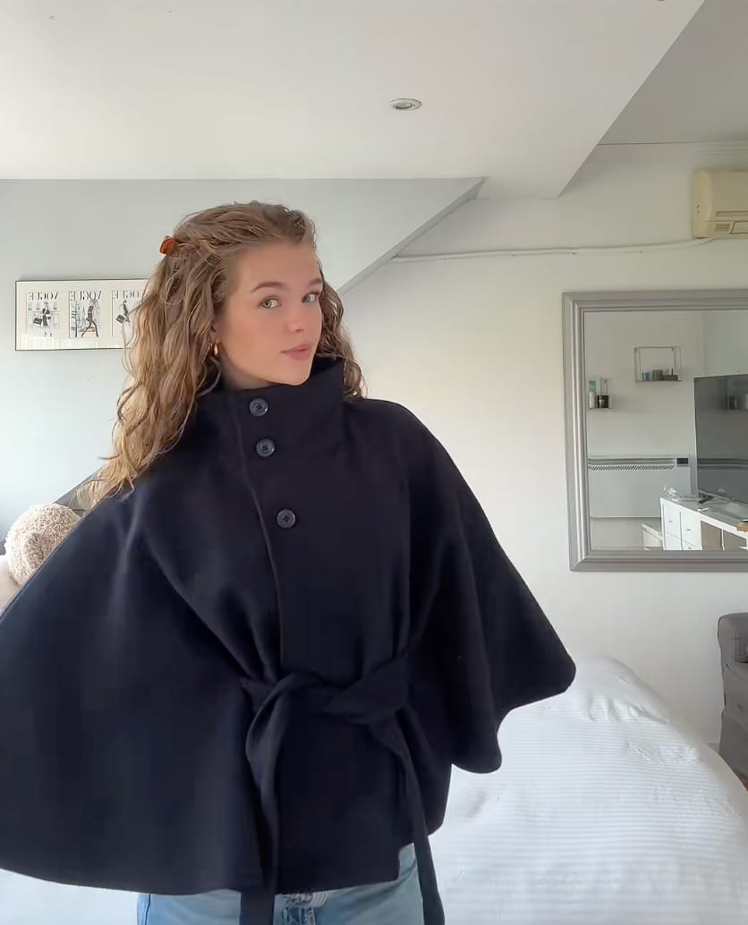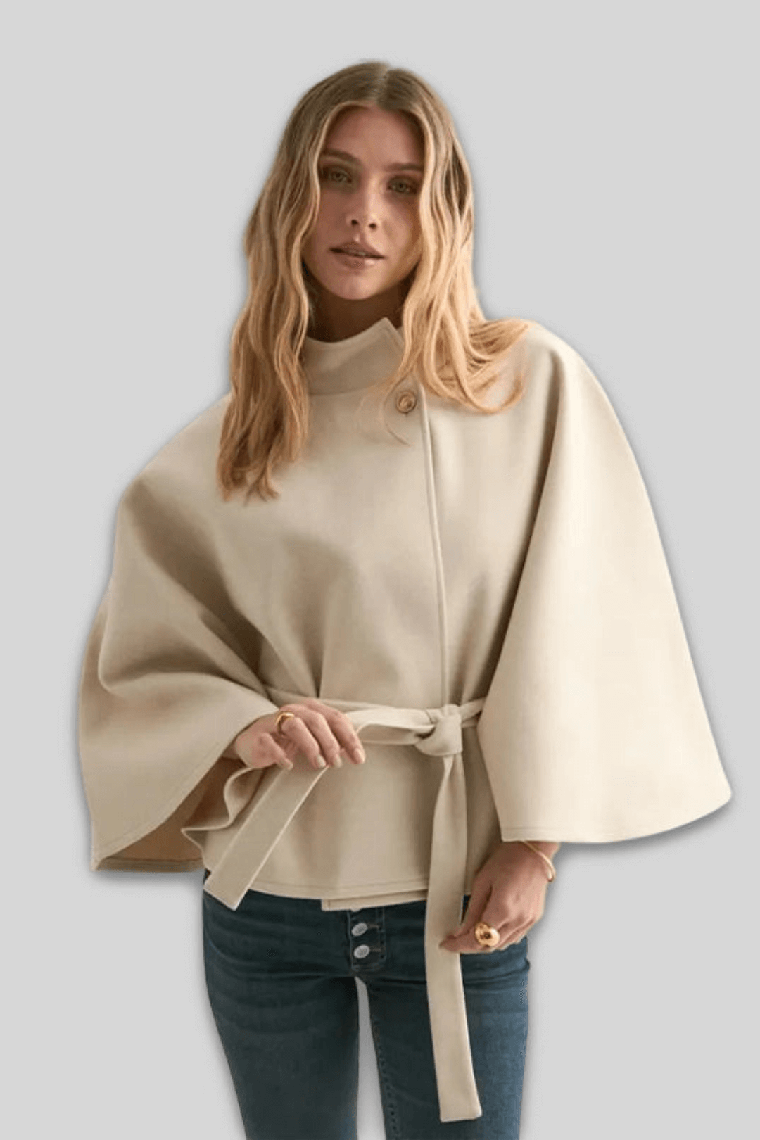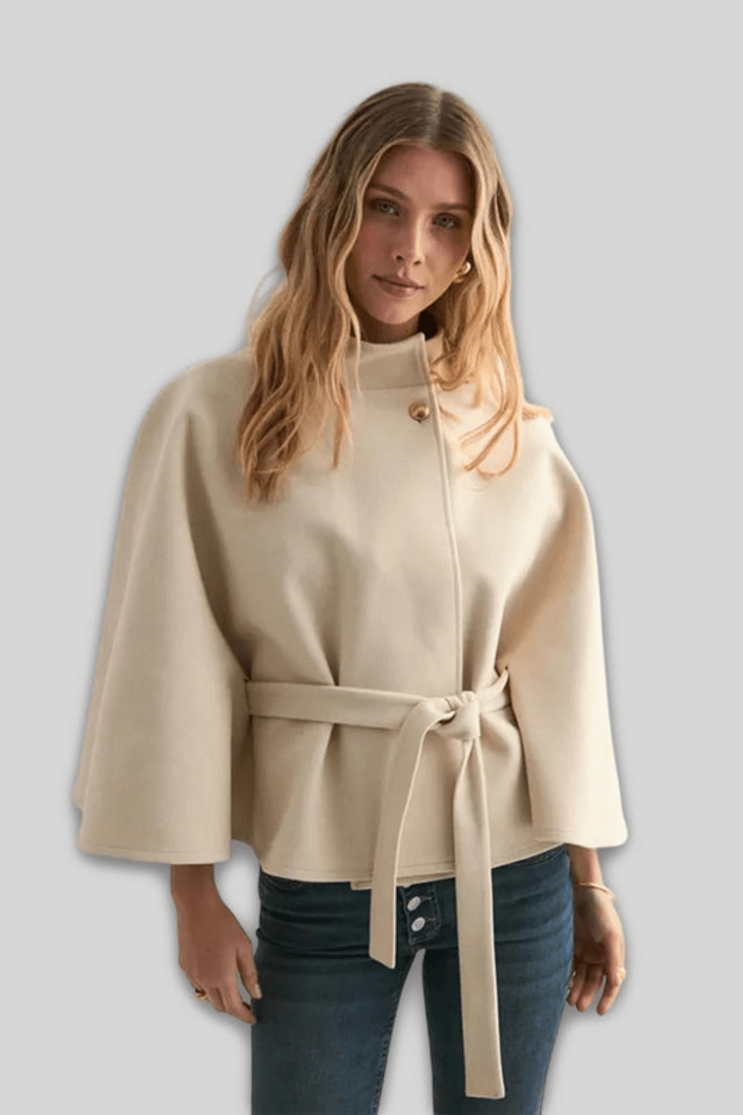 Cape-manteau élégante dotée d’une ceinture à nouer à la taille pour sublimer la silhouette. Ses manches longues et amples apportent confort et aisance, tandis que sa coupe oversize et son col montant offrent une allure moderne et sophistiquée. Fermeture pratique avec boutons discrets sur le haut pour une touche raffinée.