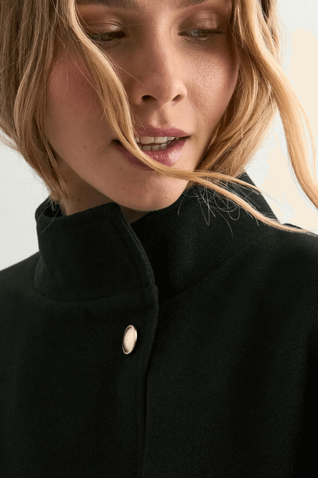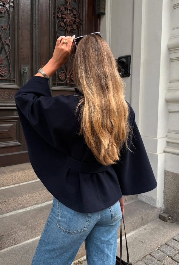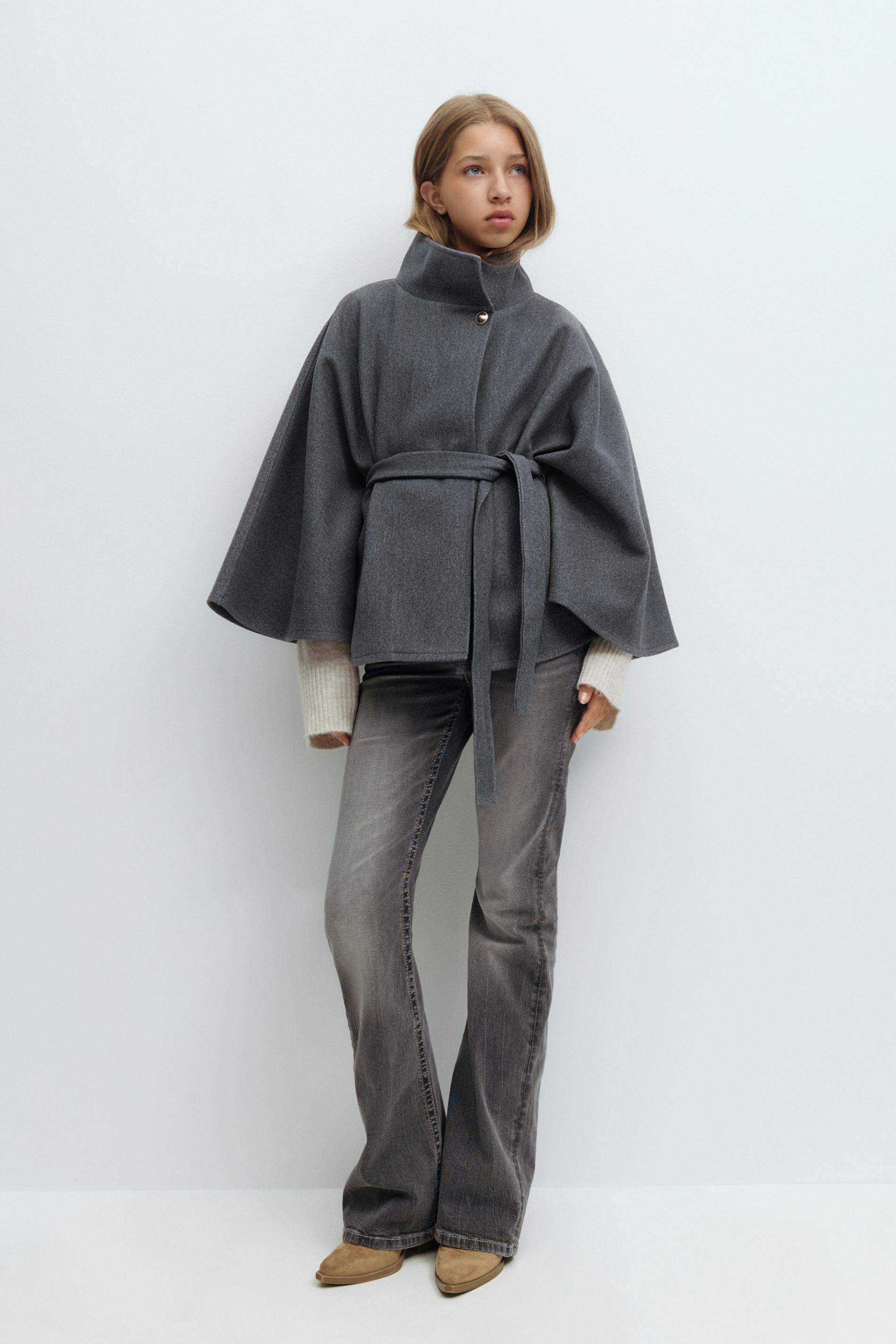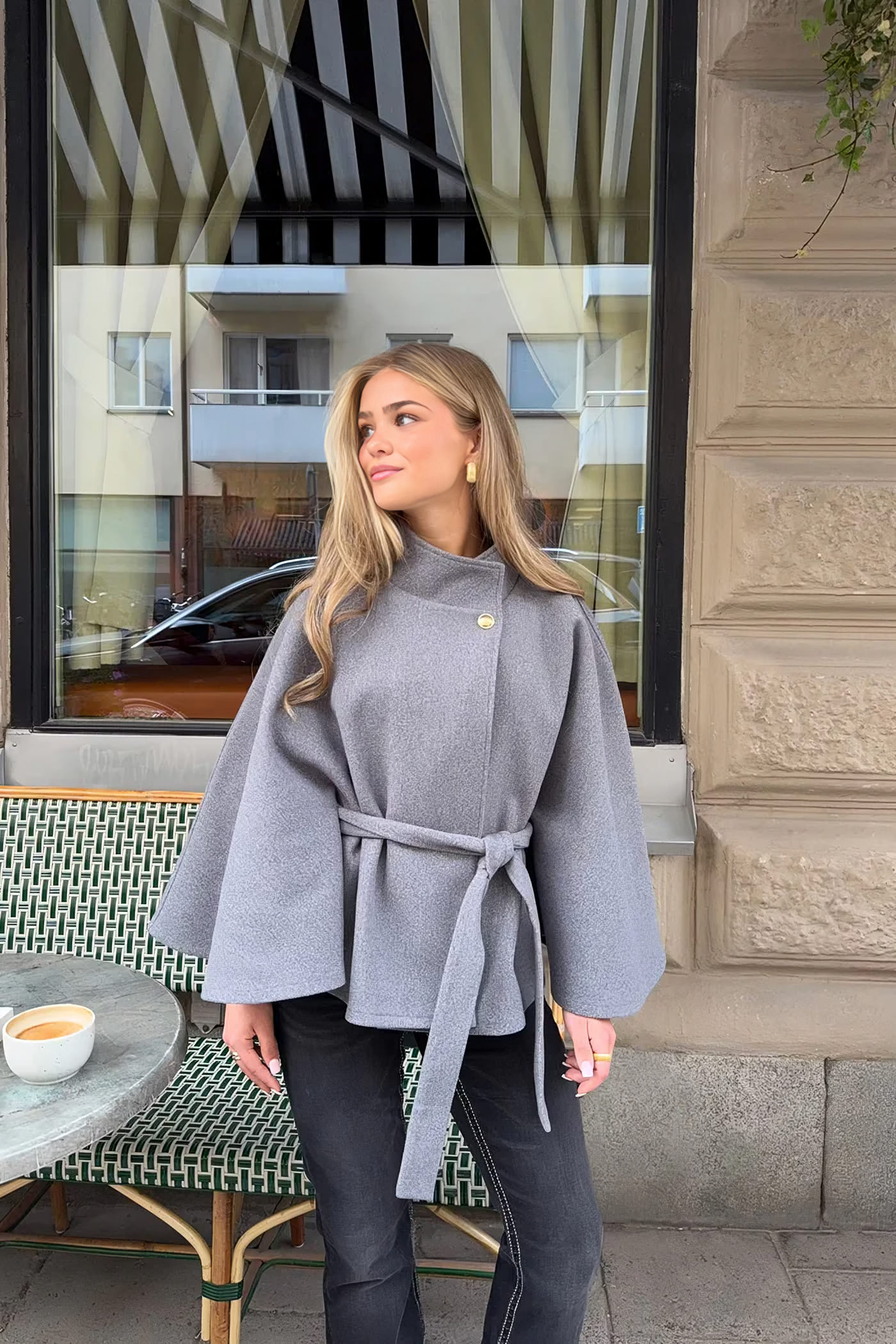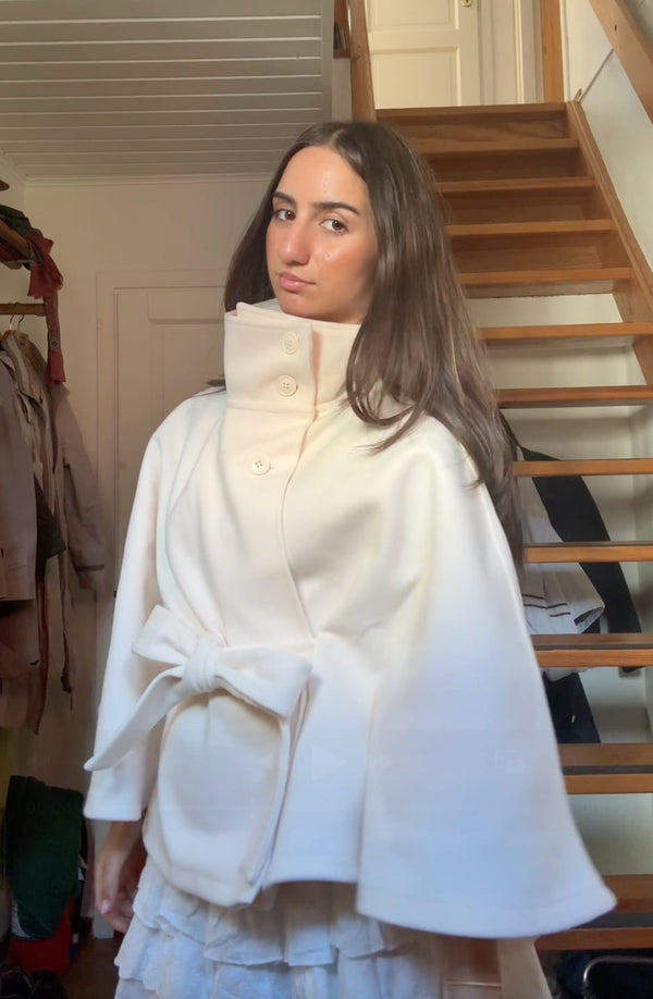 Cape-manteau élégante dotée d’une ceinture à nouer à la taille pour sublimer la silhouette. Ses manches longues et amples apportent confort et aisance, tandis que sa coupe oversize et son col montant offrent une allure moderne et sophistiquée. Fermeture pratique avec boutons discrets sur le haut pour une touche raffinée.